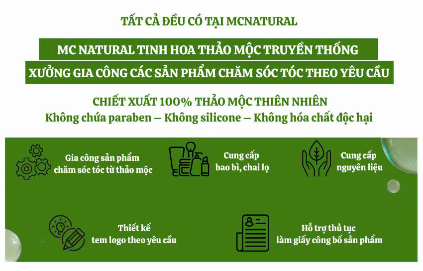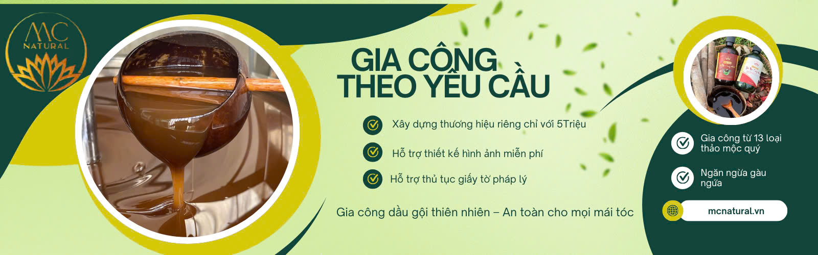 Tại MC Natural, chúng tôi chuyên gia công dầu gội thảo mộc với các thành phần tự nhiên, mang lại sản phẩm chăm sóc tóc an toàn và hiệu quả. Với công thức từ thiên nhiên, dầu gội thảo mộc của chúng tôi không chỉ giúp làm sạch tóc mà còn nuôi dưỡng và bảo vệ tóc khỏi các tác nhân gây hại từ môi trường, mang lại mái tóc khỏe mạnh và suôn mượt.